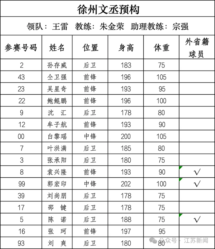 徐州文丞预构:平均年龄29.3岁,平均身高188.8cm。