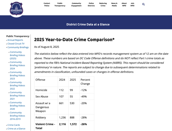 虽然特朗普在发布会上说起“紧急状态”时语气强烈,但与此形成对比的,是官方数据所显示的特区犯罪率在持续下降。