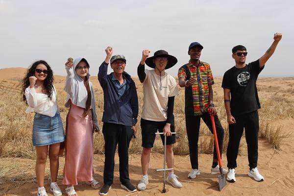 Decoding the ecological wisdom of desert control at Shapotou in Zhongwei, and touching the pulse of modern development at the Ningdong Energy and Chemical Industry Base. Eleven international youth from Beijing Foreign Studies University measured the progress of China's modernization with their footsteps and felt the essence of a real, multidimensional, and endearing China with their hearts. The photo shows international students from Beijing Foreign Studies University posing with Tang Ximing, a desert control expert.(Photo provided to Beijing Foreign Studies University)