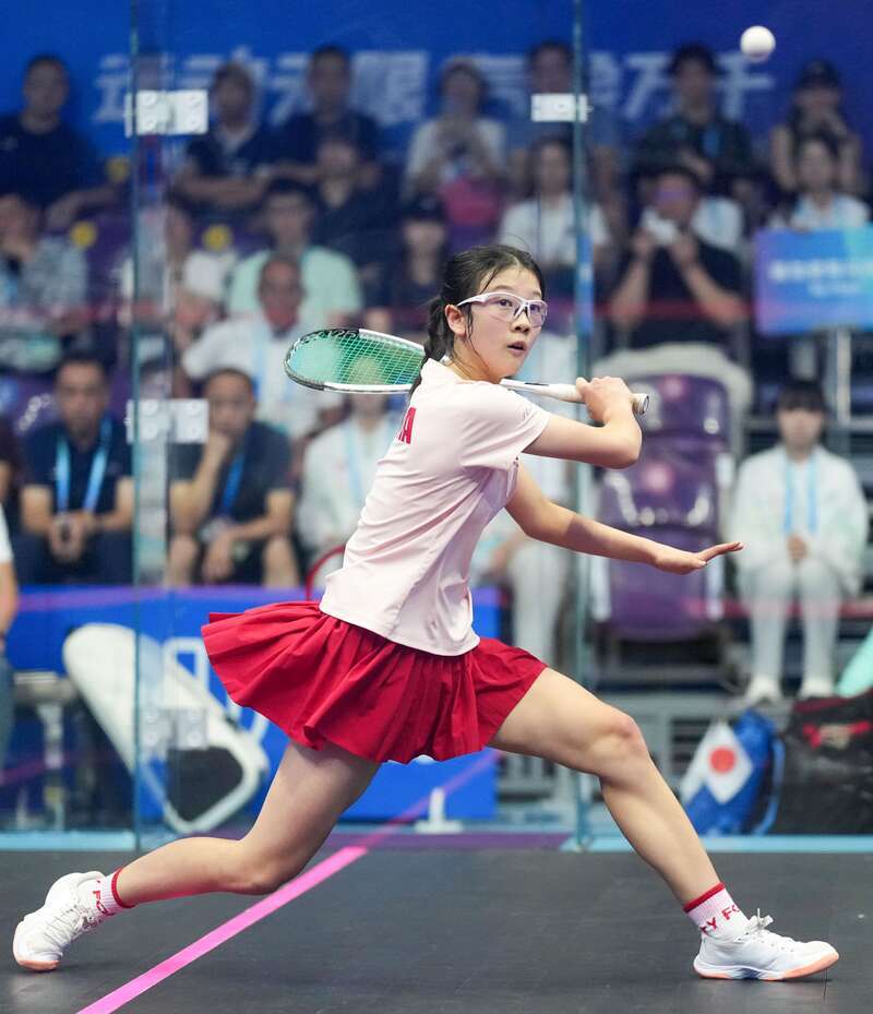 On the afternoon of August 12, 2025, the women's singles consolation final of the World Games squash event was held at the Chengdu High-Tech Sports Center's public fitness gym. This World Games has been an excellent opportunity to promote the sport of squash. Particularly, 13-year-old Yin Ziyuan has become a role model, inspiring more young people to take up the sport. The photo shows Yin Ziyuan in action during the match.(Photo provided to Xinhua News Agency)