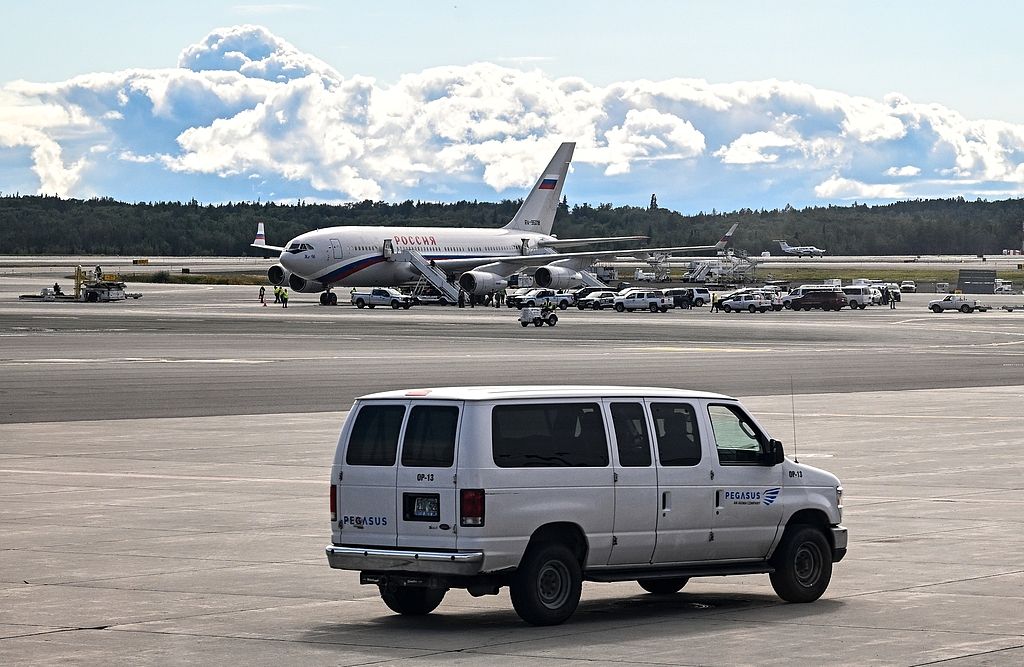 当地时间2025年8月14日,美国阿拉斯加州安克雷奇,泰德·史蒂文斯安克雷奇国际机场停机坪上,俄罗斯国家特别飞行队的一架伊尔-96-300飞机。