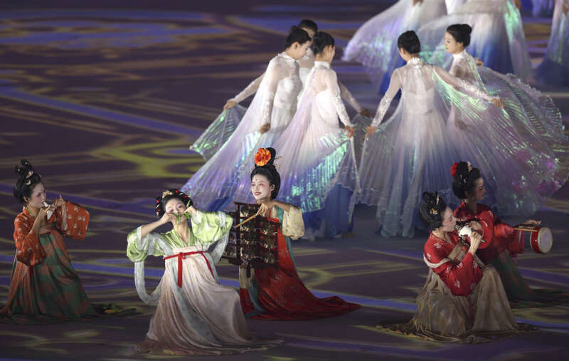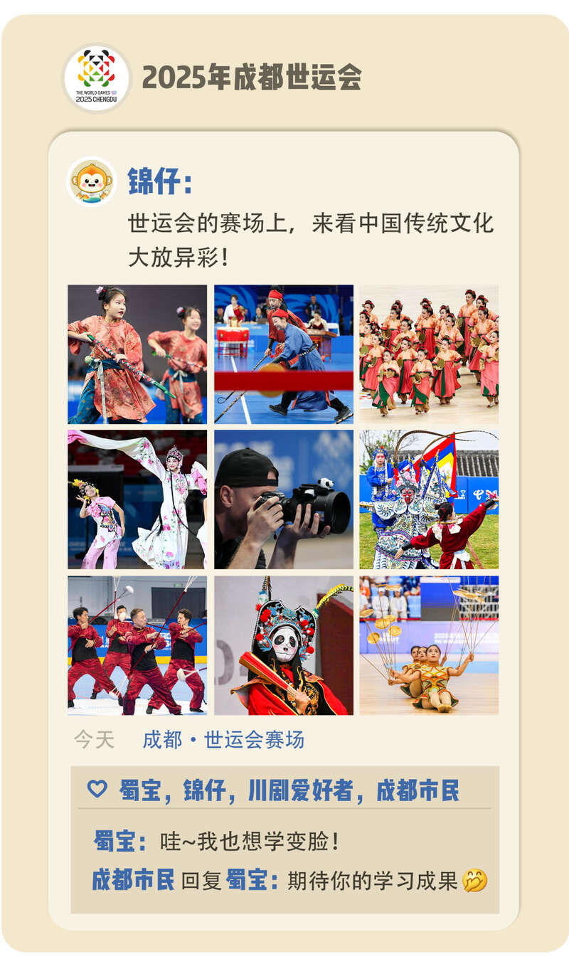 ↑8月8日,演员在成都世运会射准射箭复合弓混合团体决赛颁奖仪式前表演川剧。
