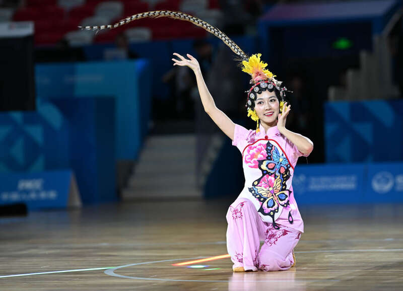 ↑8月12日,演员在成都世运会荷球混合团体赛决赛铜牌赛间隙进行杂技表演。