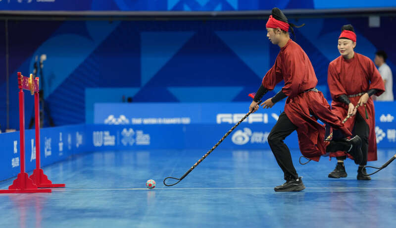 ↑这是8月6日在成都世运会软式曲棍球女子A组预赛前拍摄的步打球表演。