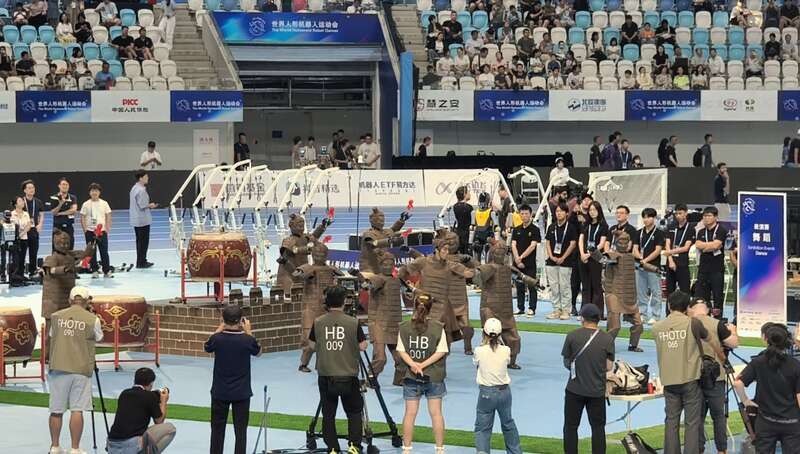 鼓声响起,9台人形机器人“光子”身披3D打印的秦俑战甲,与北京舞蹈学院舞蹈演员共同摆动双臂,跟着节奏起舞。在世界人形机器人运动会赛场一侧,这支机器人群舞节目刚开演,看台上多位观众就打开手机拍照,还有离比赛区域较远的观众索性掏出望远镜观看。