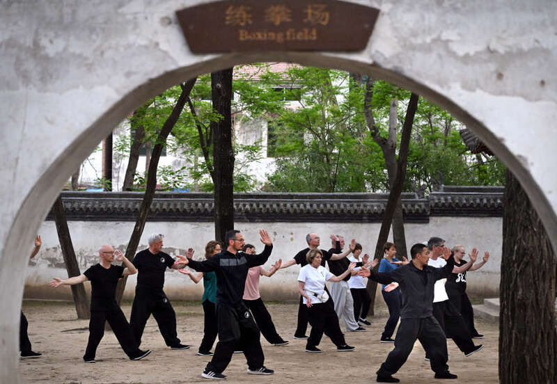 2024年4月18日,陈少拳(前左)和师父陈自强(前右)以及来自法国的学员们在陈家沟杨露禅学拳处练习太极拳。