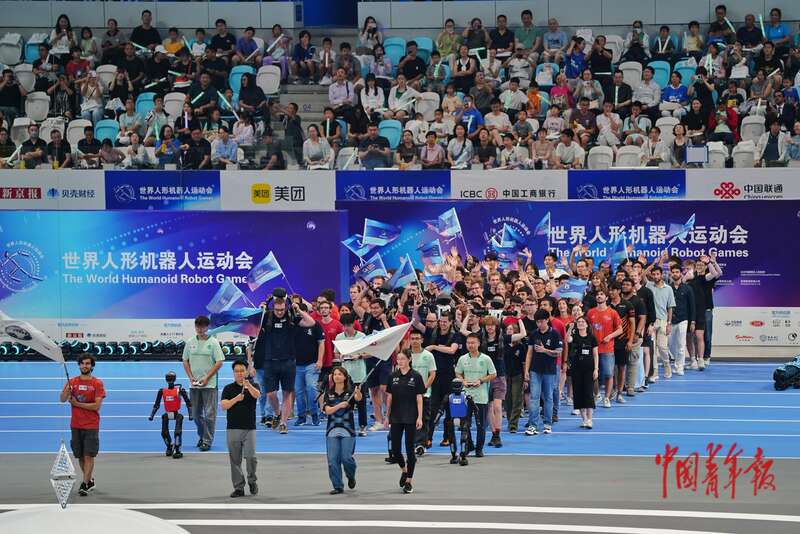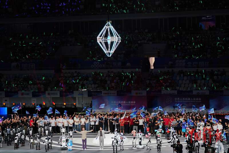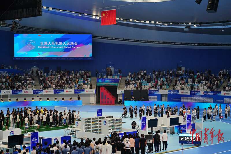 8月14日,北京国家速滑馆“冰丝带”,2025世界人形机器人运动会开幕式现场。中青报·中青网记者 赵迪/摄