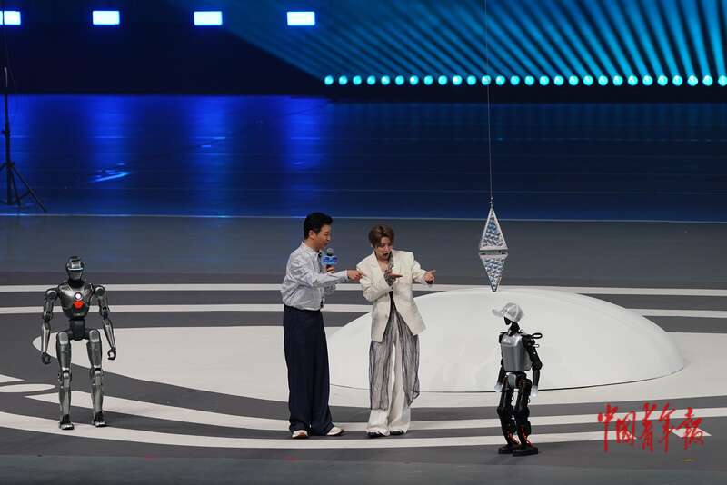 8月14日,北京国家速滑馆“冰丝带”,青年歌手刘雨昕(右)与机器人一起表演歌舞节目《欢迎来到碳基生命的世界》。中青报·中青网记者 赵迪/摄