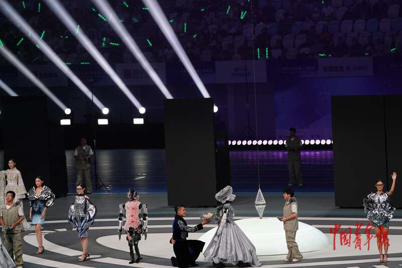 8月14日,北京国家速滑馆“冰丝带”,人们与机器人一起演绎题为《天工霓裳》的时尚秀。中青报·中青网记者 赵迪/摄