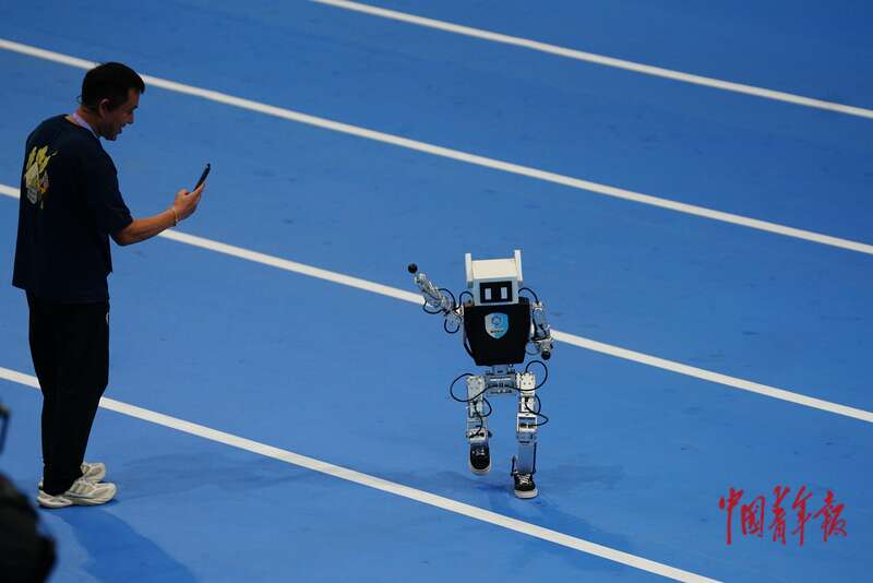 8月14日,北京国家速滑馆“冰丝带”,一位工作人员用手机拍摄一个在跑道上跑步的机器人。中青报·中青网记者 赵迪/摄