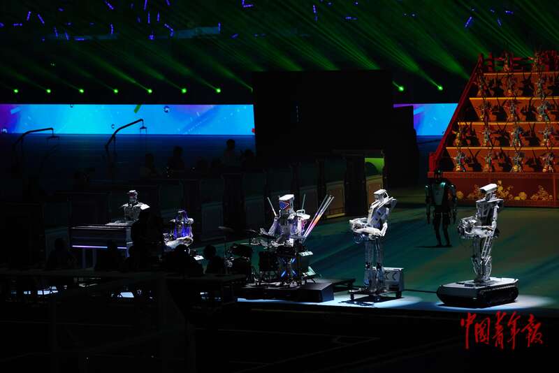 8月14日,北京国家速滑馆“冰丝带”,参与演出的机器人乐队。中青报·中青网记者 赵迪/摄