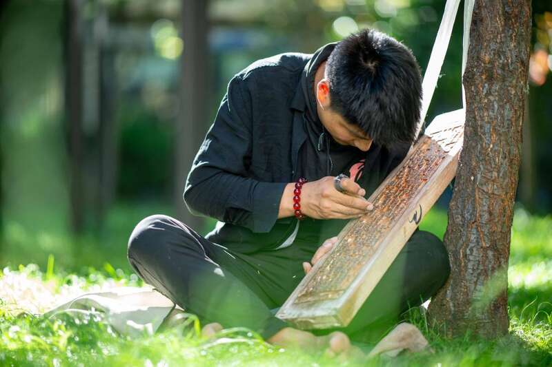 ↑ 这是一名传承西藏传统雕刻修复技艺的雕刻师(8月6日摄)。西藏传统雕刻修复技艺入选西藏自治区级非物质文化遗产代表性项目名录。