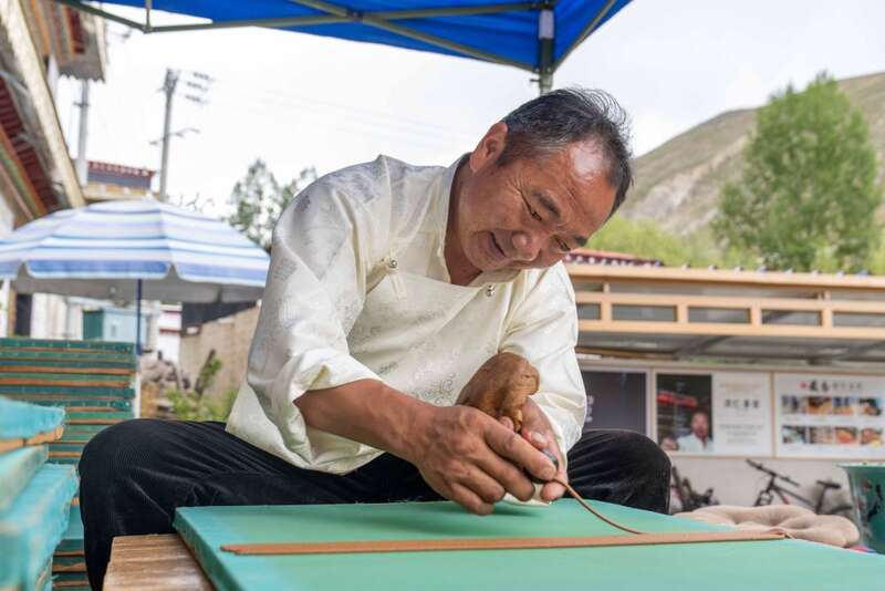 ↑ 8月6日,一名雕刻师在工作中。西藏传统雕刻修复技艺入选西藏自治区级非物质文化遗产代表性项目名录。