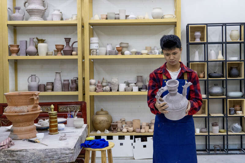 ↑ 8月6日,一名制陶师在制作陶器。藏族传统泥陶雕塑制作技艺入选西藏自治区级非物质文化遗产代表性项目名录。