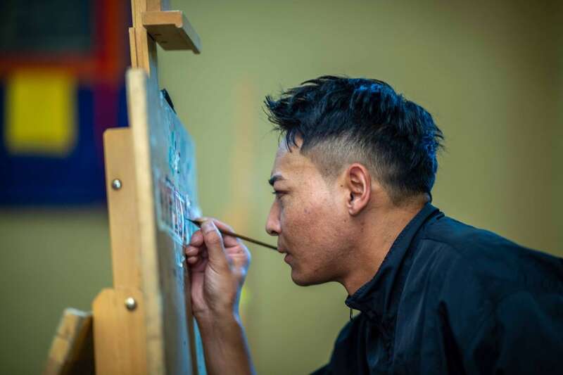 ↑ 8月6日,一名画师在绘制唐卡。藏族唐卡(齐吾岗派)入选国家级非物质文化遗产代表性项目名录。