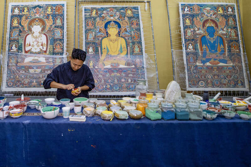 ↑ 8月6日,一名画师在制作绘制唐卡用的矿物质颜料。