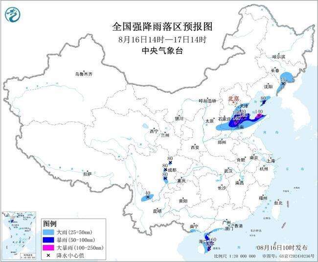 中央气象台继续发布暴雨蓝色预警:预计,8月16日14时至17日14时,吉林东南部、辽宁东部、天津南部、河北南部、山西东南部、山东北部、四川盆地西部、云南北部、广西东南部、广东西南部、海南岛中东部等地部分地区有大到暴雨,其中,河北东南部、山东北部、海南岛东部等地局地有大暴雨(100~160毫米)。上述部分地区伴有短时强降水(最大小时降雨量20~50毫米,局地可超过70毫米),局地有雷暴大风等强对流天气。