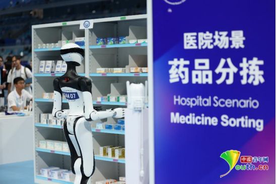 8月15日,2025世界人形机器人运动会进入首个比赛日。本届赛事最大的亮点之一是开设了场景赛,旨在展示不同机器人在不同应用场景中的表现。图为北自科技的星动纪元Q5机器人正在分拣货架上的药品。中国青年网记者 杨逸凡/文并摄