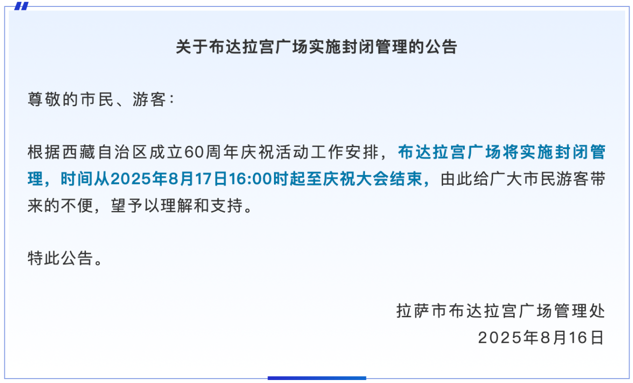 根据西藏自治区成立60周年庆祝活动工作安排,布达拉宫广场将实施封闭管理,时间从2025年8月17日16时起至庆祝大会结束,由此给广大市民游客带来的不便,望予以理解和支持。