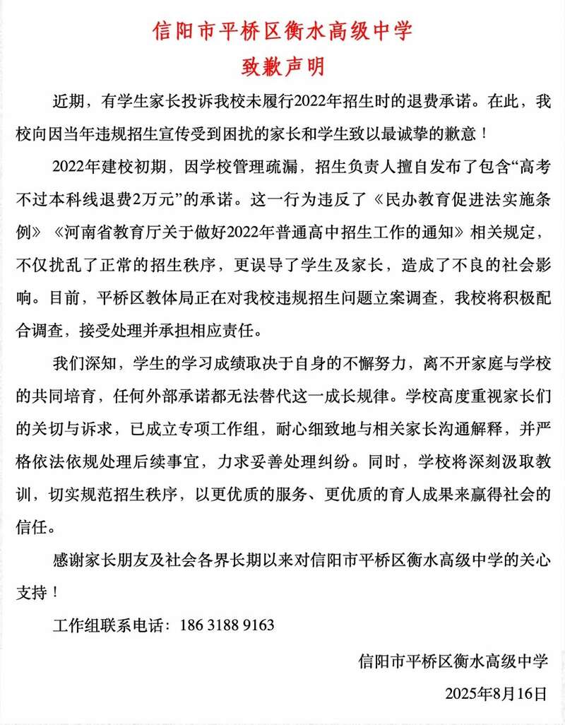 8月16日,河南信阳市平桥区衡水高级中学就“未履行招生退费承诺”一事,发布致歉声明。