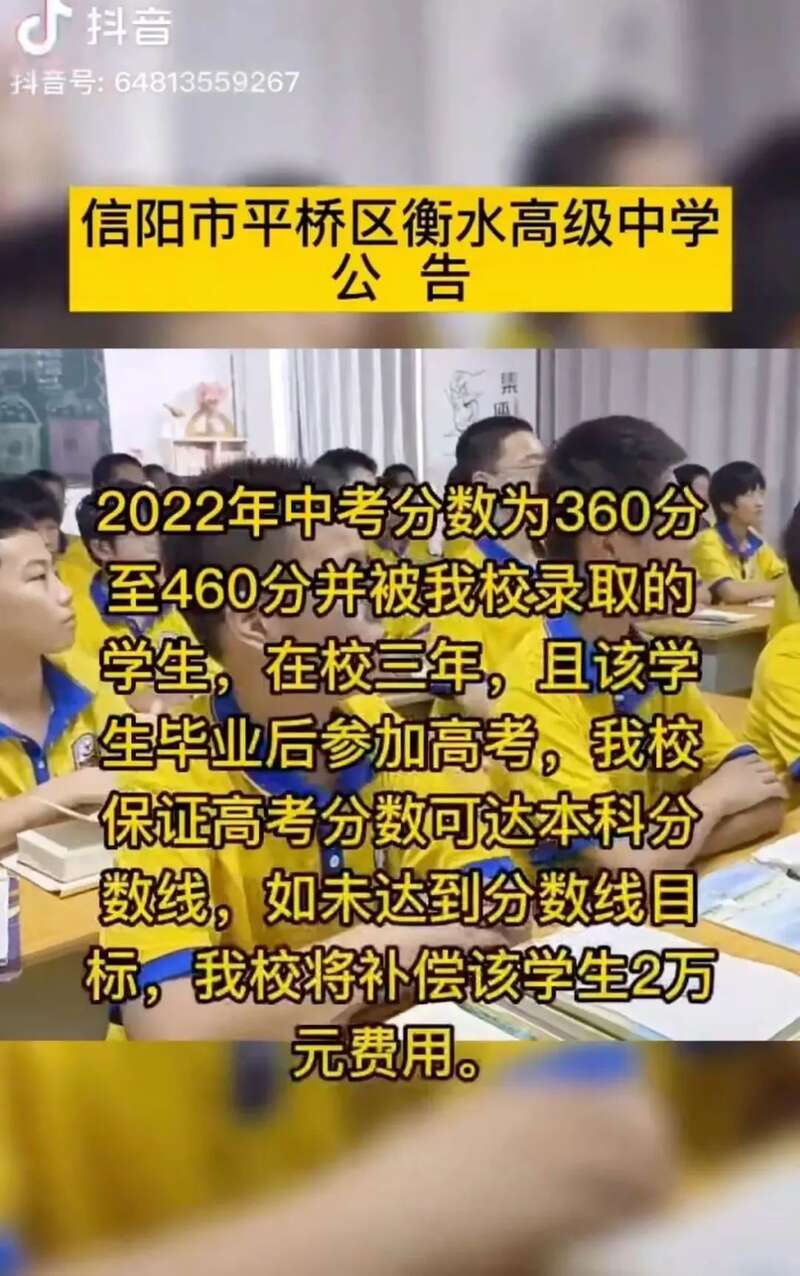 牛先生提供的视频为《信阳市平桥区衡水高级中学公告》,该视频称:“2022年中考分数为360分至460分并被我校录取的学生,在校3年,且该学生毕业后参加高考,我校保证高考分数可达本科分数线,如未达到分数线目标,我校将补偿该学生2万元费用。”