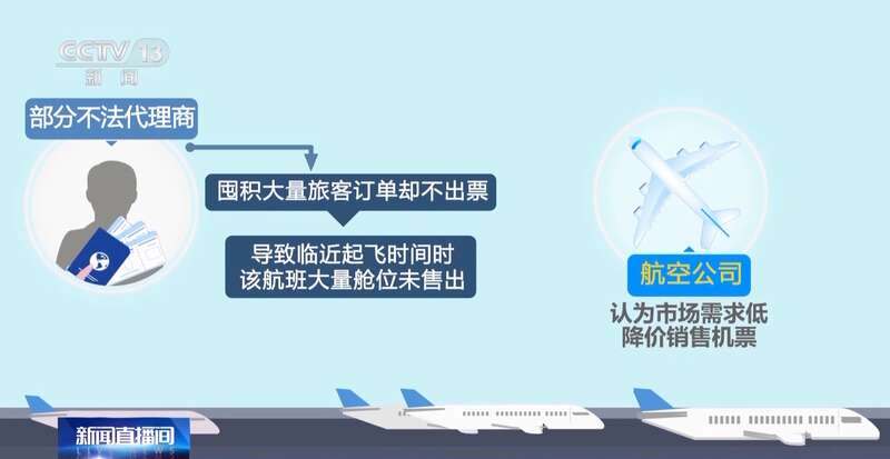 业内人士告诉记者,部分不法代理商会在手中囤积大量旅客订单却不出票,导致临近起飞时间时,该航班大量舱位未售出,航空公司会认为市场需求低而降价销售机票,一边是旅客高价购买,一边是航空公司“骨折”销售,代理商则从中赚取差价。