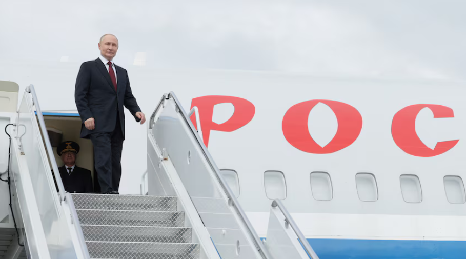 当地时间15日,俄罗斯总统普京乘专机抵达阿拉斯加安克雷奇市埃尔门多夫-理查森联合军事基地。图源:英媒
