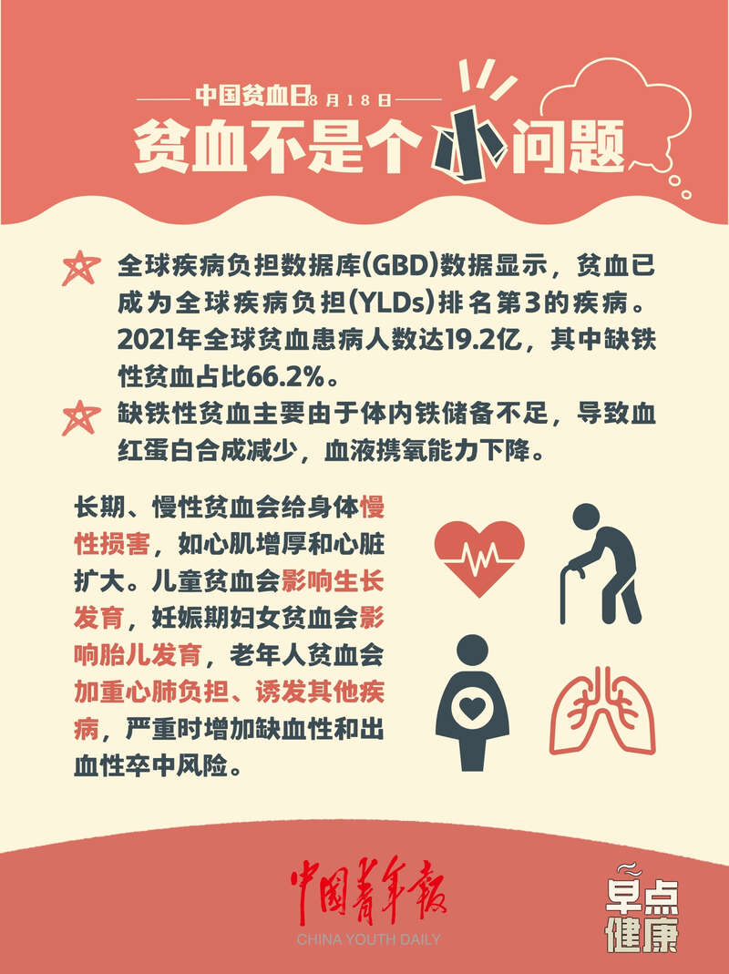 今天是第八个“中国贫血日”。很多人觉得贫血只是小问题,没有不适不会检查治疗,或觉得可以多吃红枣枸杞“补血”。然而,长期、慢性贫血,会伤及全身,引发多器官功能异常。全球疾病负担数据库(GBD)数据显示,贫血已成为全球疾病负担(YLDs)排名第三的疾病。2021年全球贫血患病人数达19.2亿,其中缺铁性贫血占比66.2%。