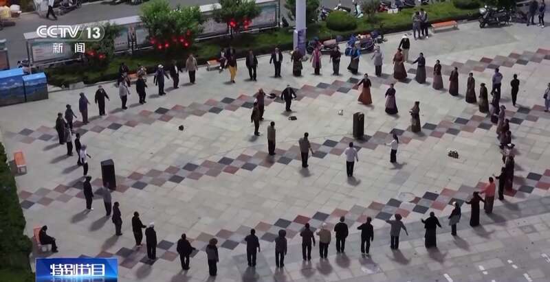 傍晚时分,社区居民吃过晚饭就会来到广场,围在一起跳起藏式广场舞“锅庄”。