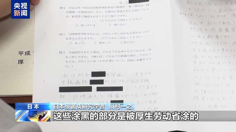 日本细菌战研究学者 川村一之:这些涂黑的部分是被厚生劳动省涂的,意思是这些内容不能为外界所知。但我调查后知晓了涂黑部分的内容:“昭和15年夏天(1940年),从哈尔滨送来了装在铁桶里的、福尔马林浸泡的人头,我们参与了将其取出的工作,并记得当时的情景”。昭和15年也就是1940年,正是731部队正式成立的时间。因此,1940年夏从哈尔滨送来的“福尔马林浸泡的人头”,不可能是除了731部队以外的其他单位所为。