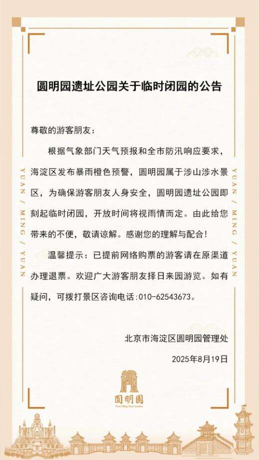 圆明园:即刻起临时闭园,开放时间将视雨情而定