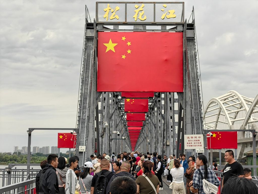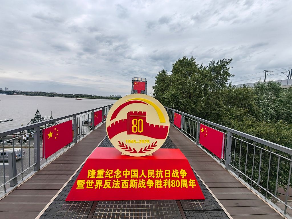 2025年8月17日,哈尔滨,百年历史的滨洲铁路桥再披“中国红”。桥头,“隆重纪念中国人民抗日战争暨世界反法西斯战争胜利80周年”的立体铁艺主题造型已安装完毕,桥身八百余面鲜艳的五星红旗迎风展示,将这座百年老桥装点成壮观的“国旗桥”。这是哈尔滨市为纪念中国人民抗日战争暨世界反法西斯战争胜利80周年特别打造的红色地标。
