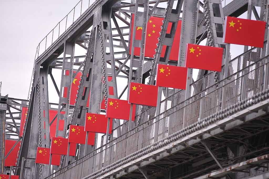 哈尔滨滨洲铁路桥“身披”百面国旗 红色地标铭记烽火岁月