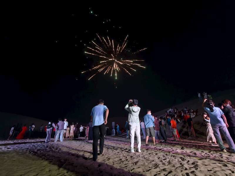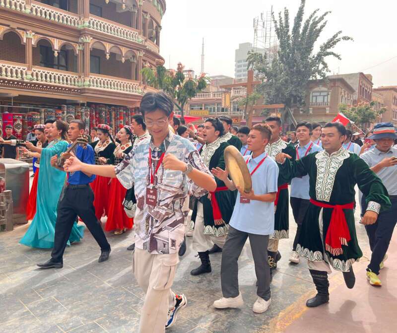 Young people from Guangdong, Hong Kong, Macao and Xinjiang joined cultural exchanges during the “Xinjiang Tour for Guangdong-Hong Kong-Macao Youth.” From traditional music and dance in Shache County’s old town to crafting lacquer fans and gathering under desert skies, the activities highlighted shared curiosity and friendship. The tour ended with fireworks, leaving participants with lasting memories of diversity and unity. (Photo provided by Zhao Tingting/China Youth Daily)