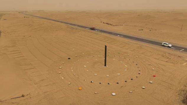 在活动现场,一座由北京联合大学艺术学院韩澄教授创作的大型地标艺术作品格外引人注目。这座伫立在沙丘之上的大型日晷装置,以“时光”为核心概念,用石头构建起三层同心圆,暗藏着对岁月流转的深刻哲思。这座作品不仅是对改造自然的复刻,更是对治沙精神的颂扬。