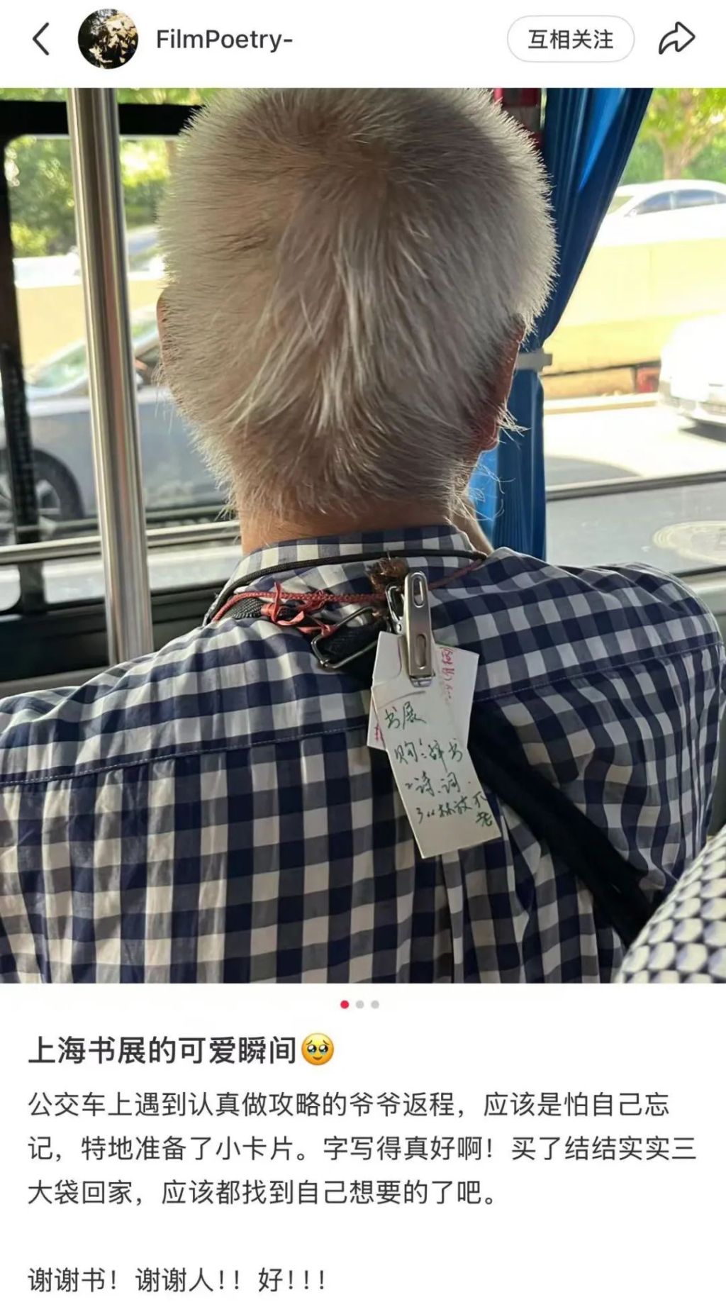 8月19日,一年一度的上海书展落下帷幕。有网友在公交车上偶遇一位逛完书展满载而归的老爷爷,“买了结结实实三大袋回家”,老爷爷衣领上别着两张小卡片,上面写满了买书攻略。