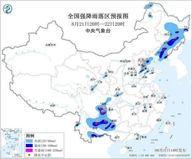 预计,8月21日20时至22日20时,内蒙古东北部、黑龙江中南部、吉林中东部、辽宁中东部、北京东北部、天津、河北东部和南部、山西南部、宁夏中部、甘肃西南部、四川盆地中南部、贵州中西部、云南中东部、广西西北部等地部分地区有大到暴雨,其中,吉林北部、辽宁北部、四川盆地南部、贵州西部、云南东部等地局地有大暴雨(100~220毫米)。上述部分地区伴有短时强降水(最大小时降雨量20~50毫米,局地可超过80毫米),局地有雷暴大风或冰雹等强对流天气。