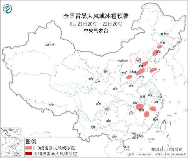 中央气象台8月21日18时继续发布强对流天气蓝色预警: