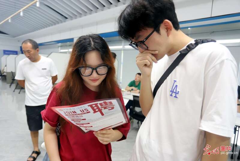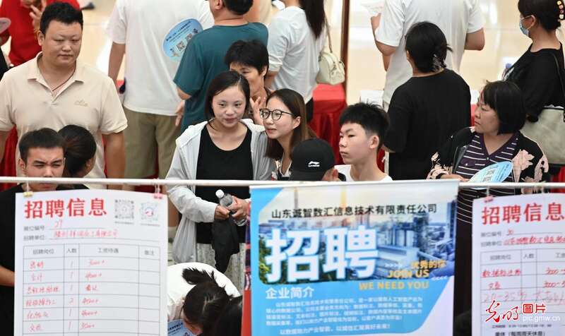 山东省青州市举办暑期企业推介暨人才招聘会,近百家企业提供了涉及机械制造、家政餐饮、健康养老、医药化工等领域的3000多个岗位,吸引了许多求职者前来咨询应聘。图为求职者在招聘会上了解岗位信息。(王继林摄/光明图片)
