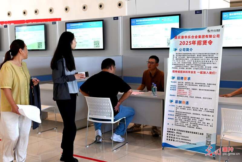 江苏省连云港市人力资源和社会保障局举办面向高校毕业生等青年的就业服务攻坚行动专场招聘会。招聘会整合岗位资源、职业指导及政策支持,助力离校未就业毕业生快速融入职场。现场共有56家企事业单位,为毕业生提供1200个岗位。(朱德富摄/光明图片)