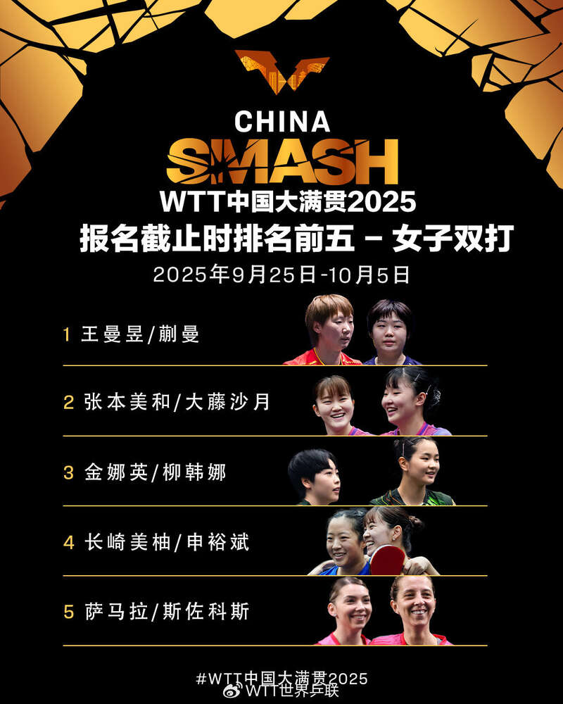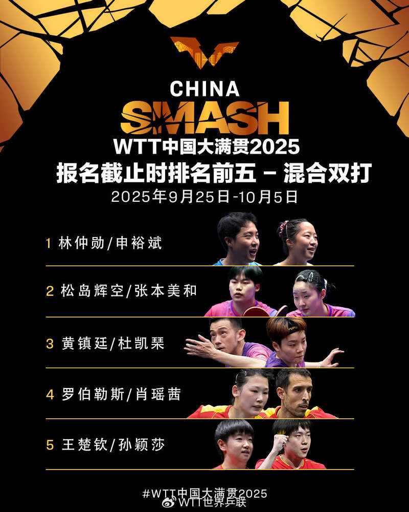 9月25日至10月5日,WTT中国大满贯2025将在北京石景山首钢园举行。报名截止时,排名前五名单如下,一起为国乒加油!