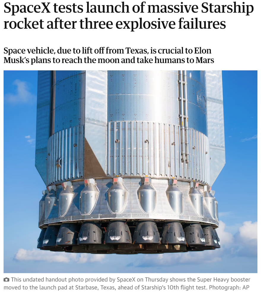 此前,“星舰”已经进行了九次试飞,其中五次失败,用《卫报》的话说,“失败次数超过成功次数,且今年前三次试飞均以爆炸告终,残骸散落至加勒比海区域”。