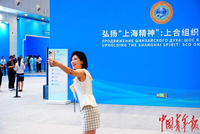 8月28日,天津,2025年上海合作组织峰会新闻中心,一位记者在峰会标识前自拍留影。标语版上印有“弘扬‘上海精神’:上合组织在行动”的字样,这是中国担任2024至2025年上海合作组织轮值主席国提出的口号。马子倩/摄