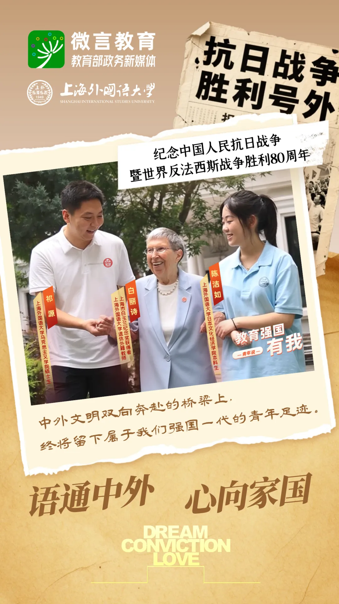 习近平总书记强调,广大青少年生逢其时,要赓续红色血脉,树立强国有我的远大志向,做堂堂正正、光荣自豪的中国人,勇担民族复兴的时代大任。2025年是中国人民抗日战争暨世界反法西斯战争胜利80周年,教育部政务新媒体推出“教育强国,有我!”网络主题宣传活动之“青年说·传承篇”系列,挖掘高校里的红色记忆,展现青年师生的时代担当。今天 ,跟教育小微一起来看 上海外国语大学师生用语言守护和平的故事——