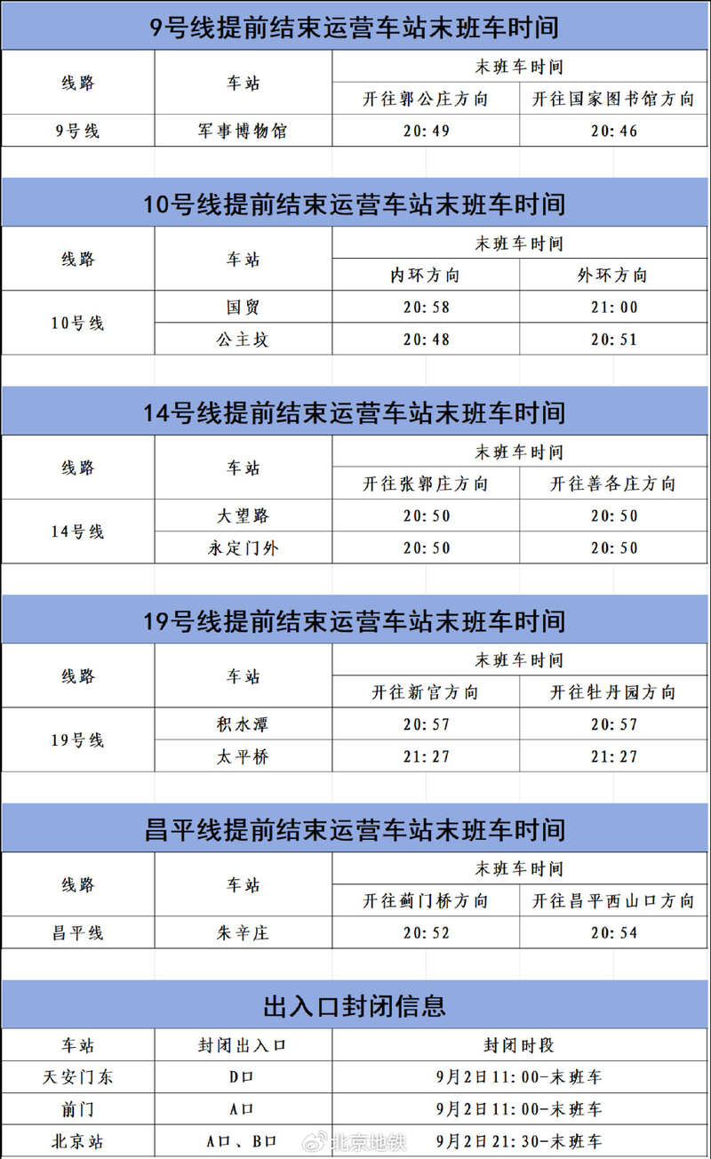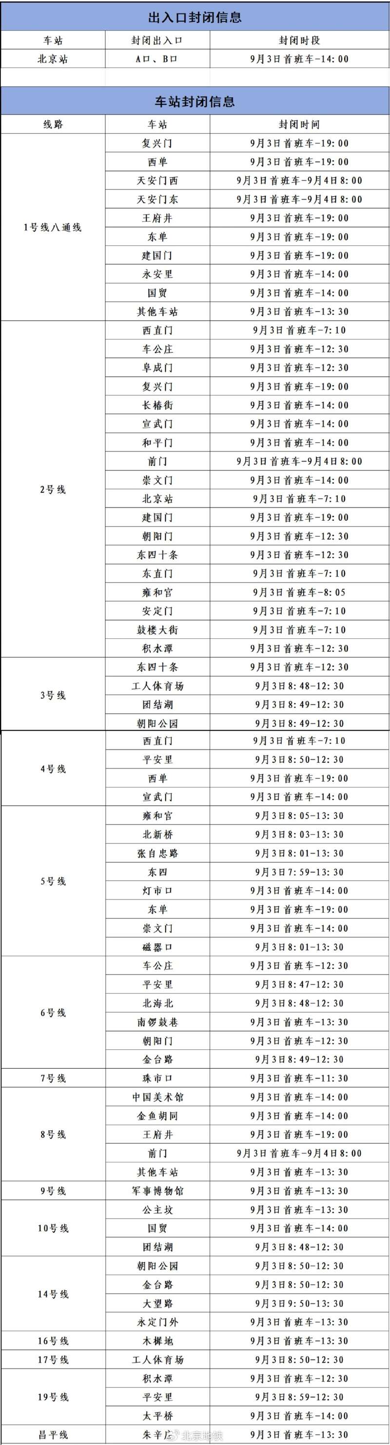一、2025年9月3日首班车起至19:00(继续封闭车站除外),地铁1号线八通线、2号线、3号线、4号线、5号线、6号线、7号线、8号线、9号线、10号线、14号线、16号线、17号线、19号线、昌平线部分车站、出入口分时段封闭。