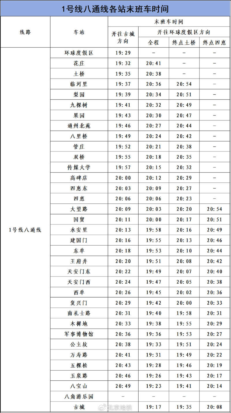一、1号线八通线提前结束运营,古城始发的全程末班车时间为19:17、环球度假区始发的全程末班车时间为19:29;1号线八通线各站末班车驶离后,与1号线八通线换乘的部分车站封闭至各线路运营结束(2号线复兴门、建国门,4号线西单,5号线东单,8号线王府井,9号线军事博物馆、10号线国贸、公主坟,14号线大望路)。