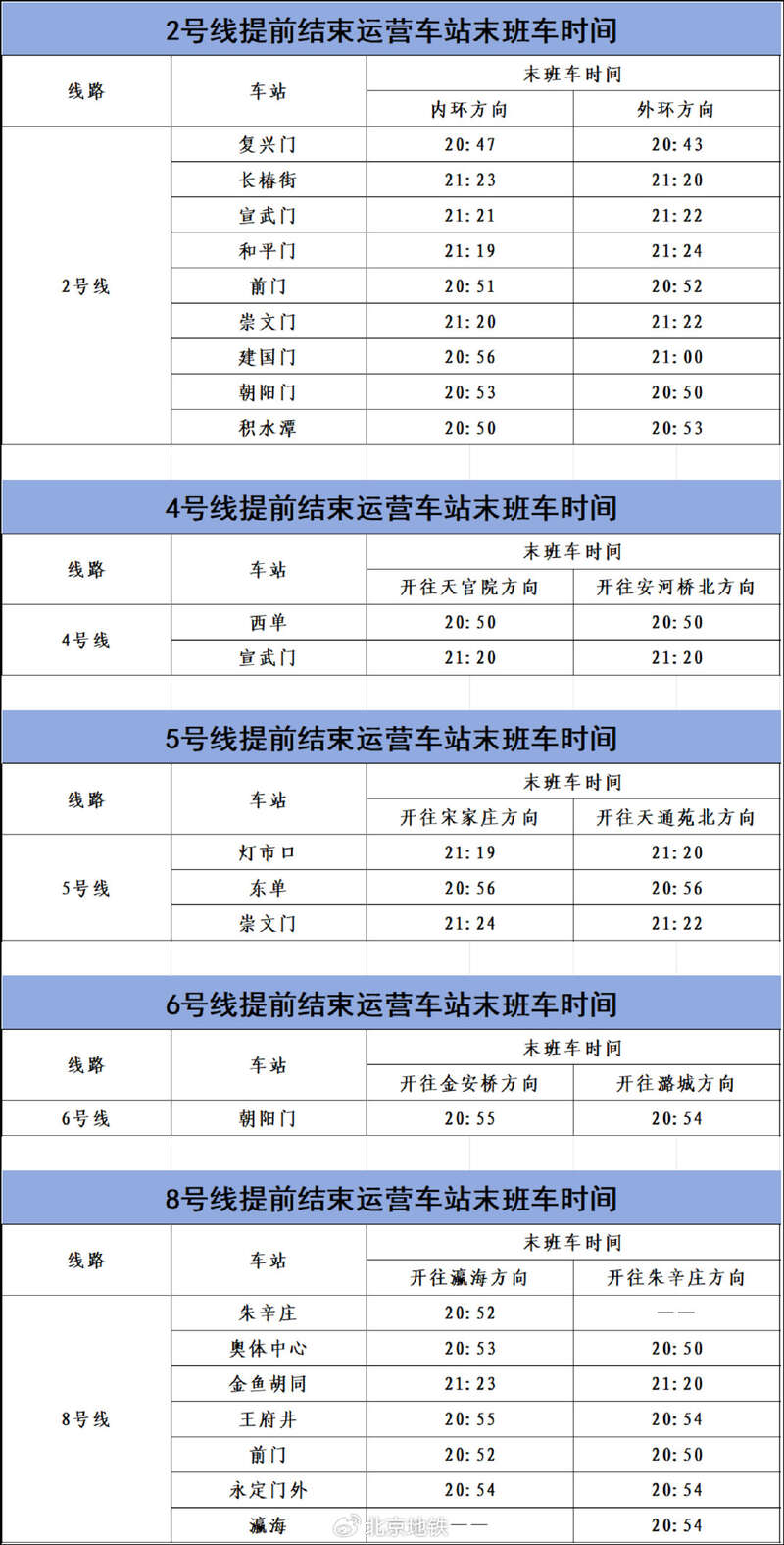三、2号线和平门、长椿街、宣武门、崇文门,4号线宣武门,5号线灯市口、崇文门,8号线金鱼胡同,19号线太平桥,上述车站21:30前陆续封闭。