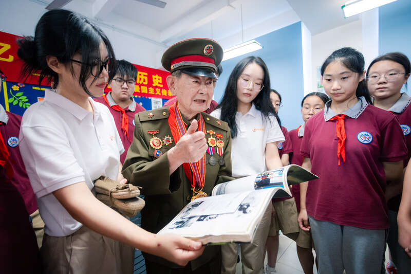 更令人振奋的是,革命老兵程上雁身着旧军装、佩戴勋章走进教室。他回忆起革命战场上的日夜跋涉和艰苦环境,言语朴实却震撼人心。学生们认真聆听,课后为老兵献上鲜花,佩戴好红领巾,表达对英雄最真挚的敬意。“正是有先辈们的牺牲,才有我们现在的幸福生活,所以我们更要珍惜当下,争做新时代的好少年,将这份精神始终传承下去,不辜负先辈们的希望。”苏州市第三十中学学生张子晗说。