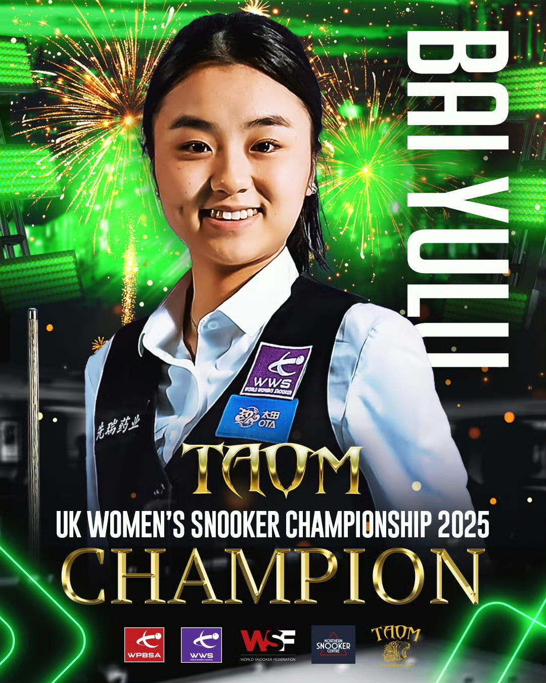 祝贺!白雨露卫冕女子斯诺克英锦赛冠军