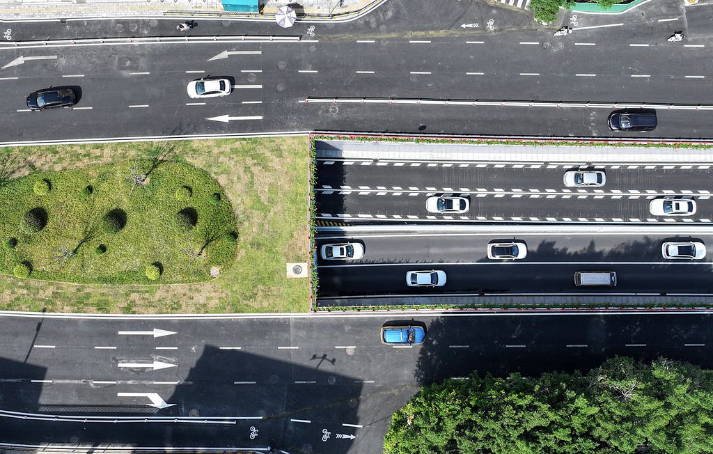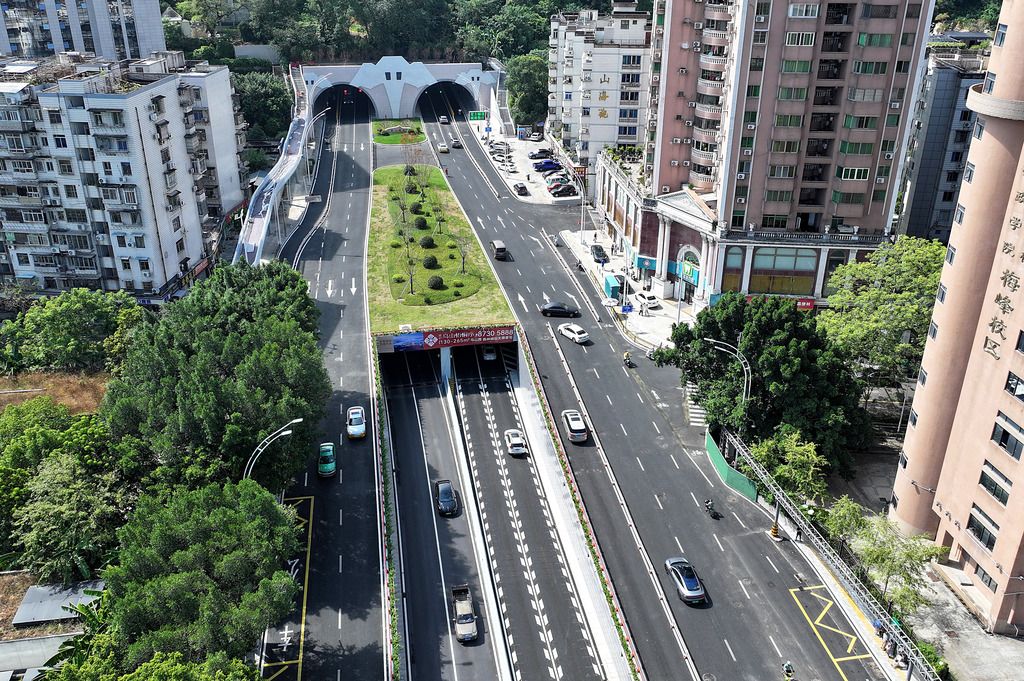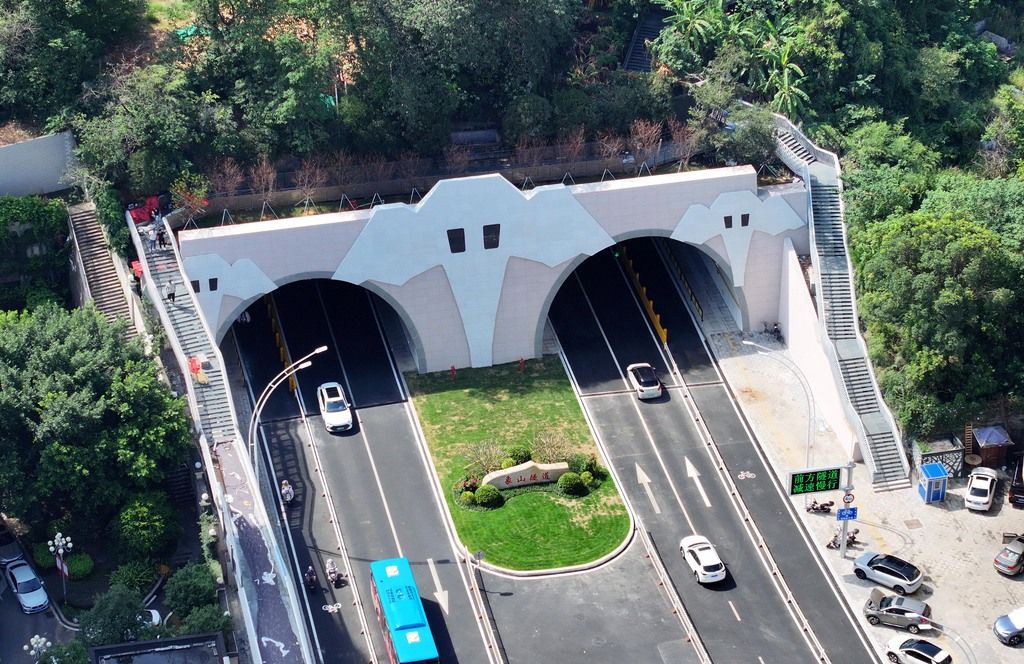 2025年9月2日,车辆通过福州象山隧道。近日,中国首例由四联拱隧道拓宽为上下双层隧道工程——福州象山隧道改造完工后全面开放通行,象山隧道也成为福州市首座双层隧道。改造后,隧道升级为双层结构,实现双向8车道通行,并预留远期双向10车道的扩容条件(无人机照片)。 中新社记者 张斌 摄